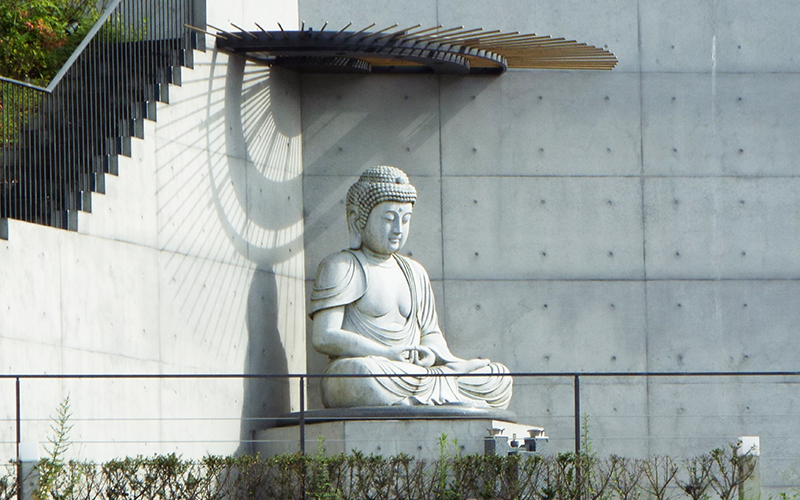 納骨堂はバリアフリーでお参りがしやすくなっております。納骨堂外観の阿弥陀如来坐像