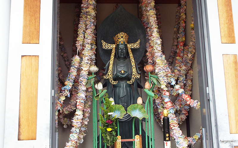 本堂前の救世観音菩薩様は「花の観音様」として親しまれ、縁結びの観音様として遠方からもたくさんの方がお参りされております。