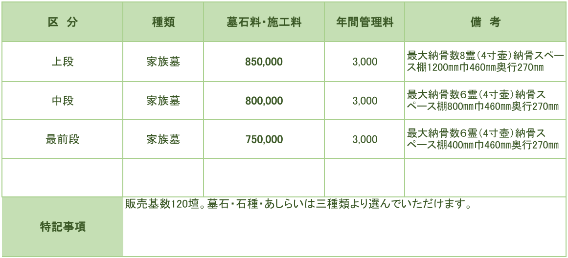 想いが伝わる『天寿の廻廊』 はご家族の供養やスタイルに合わせて上段・中段・最前段の三種類からお選びいただけます。又墓石、石種などお好きなデザインを選ぶことが可能です。
